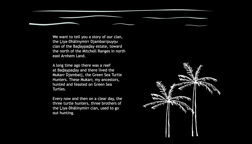 We are learning from the moment we are born - not just about one topic but about the whole ecology of life and how everything works together. Our world makes sense through our connection to each other, to animals, tides, plants, clouds, and all other elements of Country. We work our whole lives to understand the sophisticated knowledge system of these songlines. Senior Custodians and Djungaya (Caretakers) from these clans shared their knowledge and supported the transformation of the songline into the book you see here. This story we are making is for everyone, so you can view it whenever you like . Welcome to this story that you will experience here today. The knowledge we are sharing here was created as a digital Ancestor for our young people so they can be strong in the knowledge of who they are. We are also choosing to share this with you, to help bridge the gap in understanding between our cultures. We have been told for a long time that we need to do things Balanda way. Now we are asking that Balanda respect us, our culture and the knowledge we carry.
