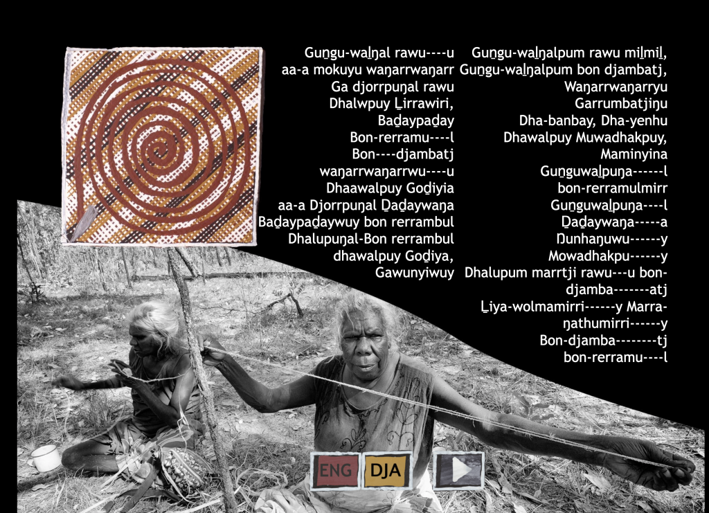 The words in the songline are a map that connect us to everyone in our clan nation; the land, the water, the turtle, the wind and the tides. All the elements are awakened by these songs. When we sing , we feel like ew are sitting, facing a mirror. We are seeing all those things and places inside ourselves. The Mukarr Djambatj songlines are used during funeral ceremonies, where all clans related to the Ḻiya-Dhälinymirr clan nation have responsibility to work together to sing the spirit of the deceased to their final resting place. In funeral ceremonies, the strong vision in our head connects the spirit to places as well.