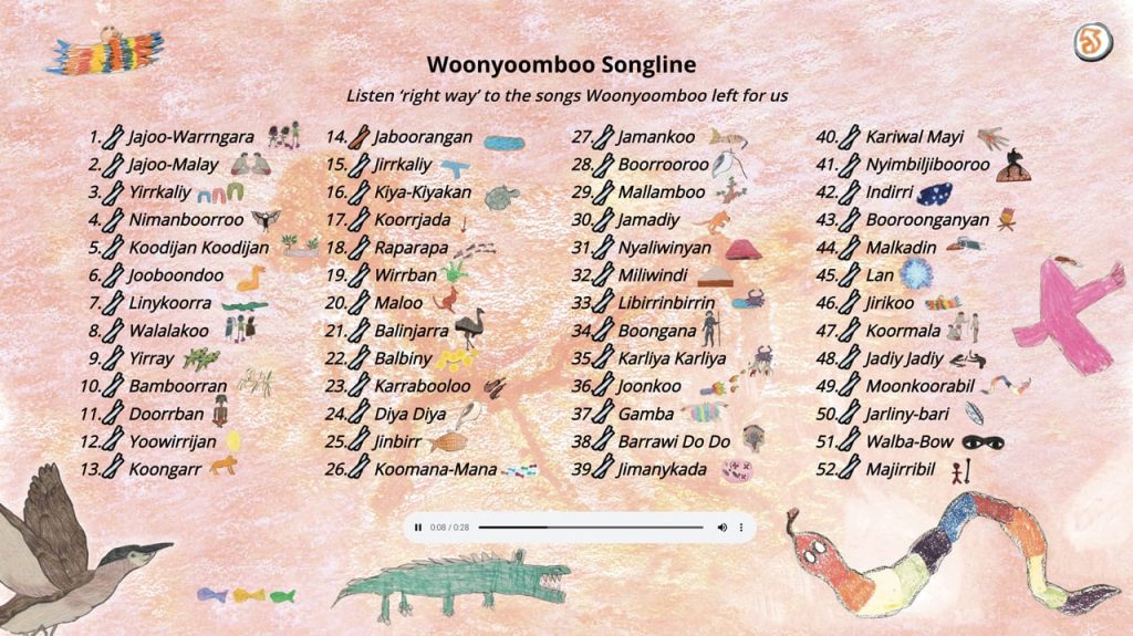 The Woonyoomboo Creation Story and songs were handed down from Darby Jayi-Kali Narngarin to his daughter Annie Nayina Milgin. The creation of this work was a journey that took place over several years. Groups of young Nyikina people explored Nyikina Country as part of the Digital Storytelling Program under the guidance of senior custodians, learning the stories and songs of Woonyoomboo: the Night Heron from the site of their creation.